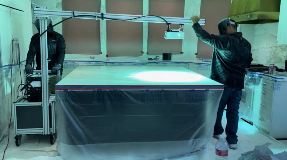 - UV Curing: Using our proprietary UV technology, the sealer is cured in just a few seconds, creating a hard, durable coating that is as strong as marble itself.
